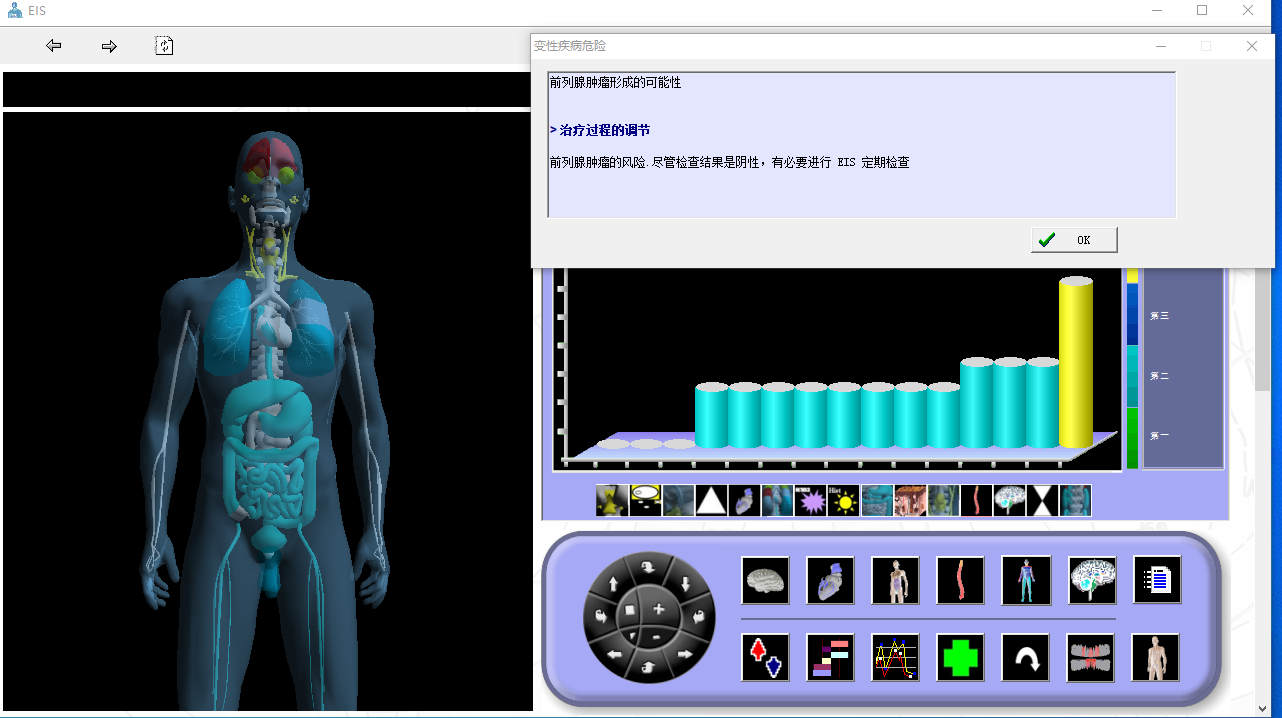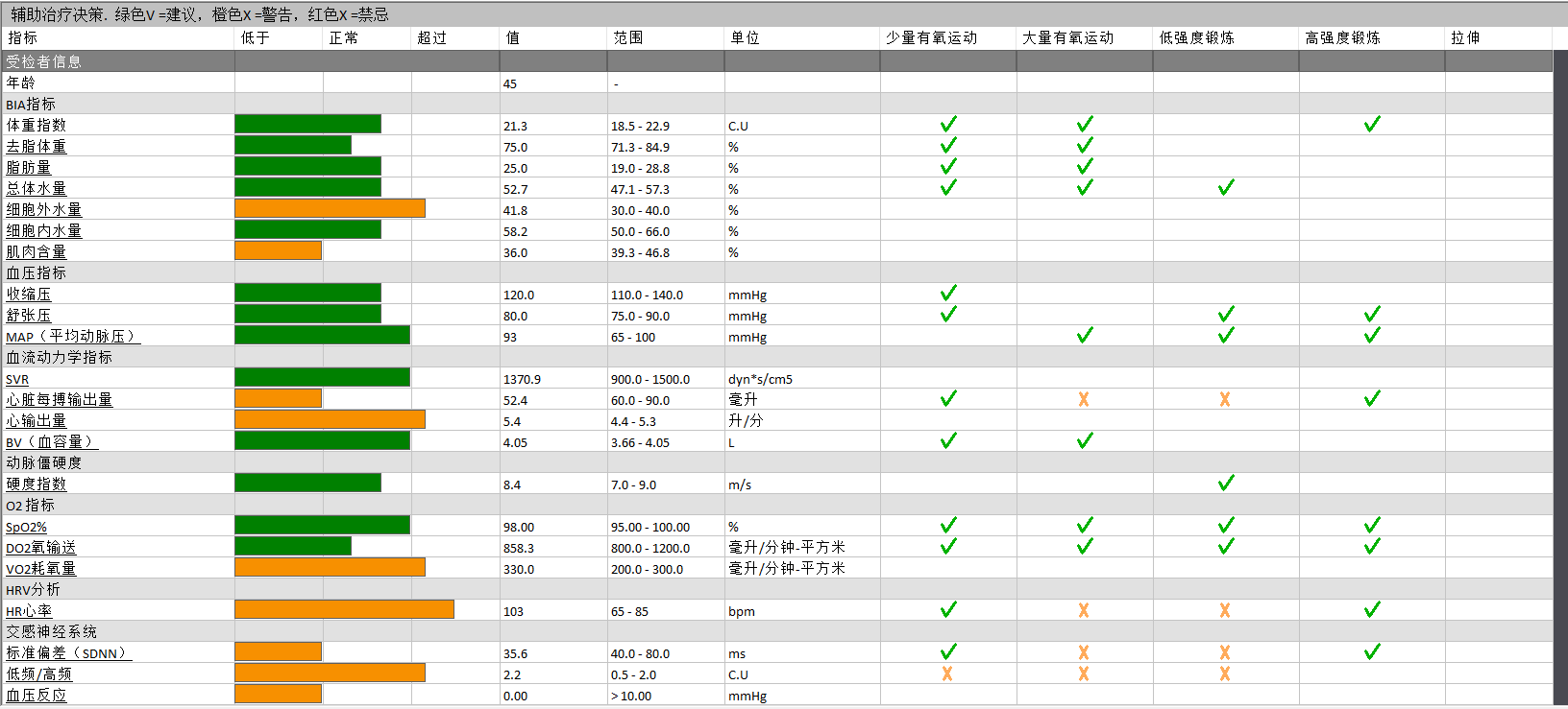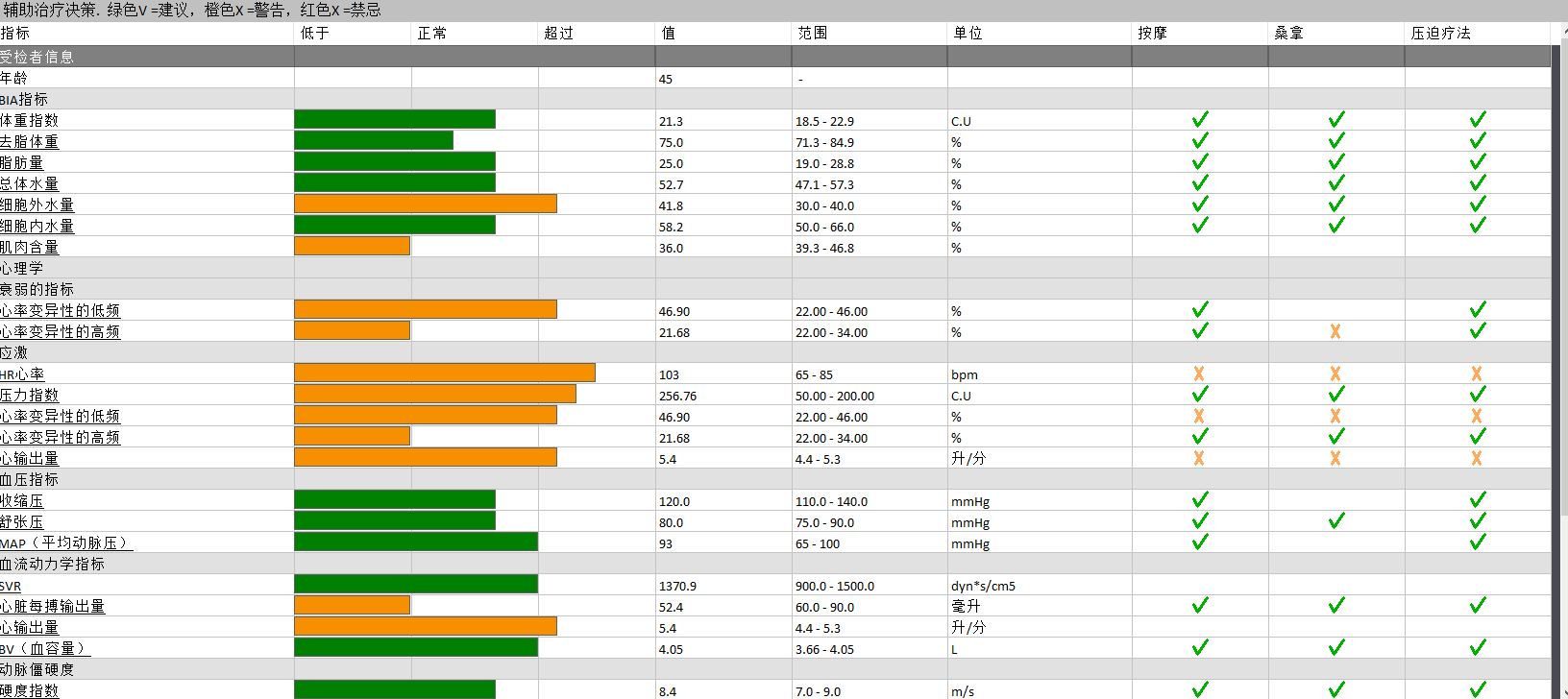 (十五大系統風險柱狀圖)、健康管理(經絡、耳穴、整骨療法、補充檢查、生物電療法、食物建議、健身運動指標等)