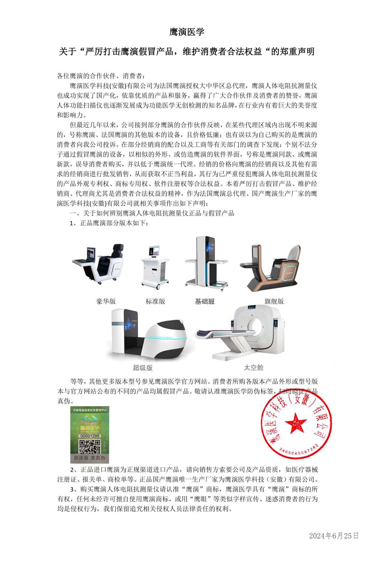 這些假冒產品外觀上與正品很相似,但質量和性能卻大打折扣。它們往往采用低劣的原材料和零部件進行生產,無法提供準確的檢測結果。更為嚴重的是,這些假冒產品往往沒有通過藥監局的審查,存在著嚴重的安全隱患。消費者在購買和使用這些假冒產品時,不僅無法獲得準確有效的健康檢測服務,還可能對身體健康造成危害。鷹演醫學再次嚴正聲明.